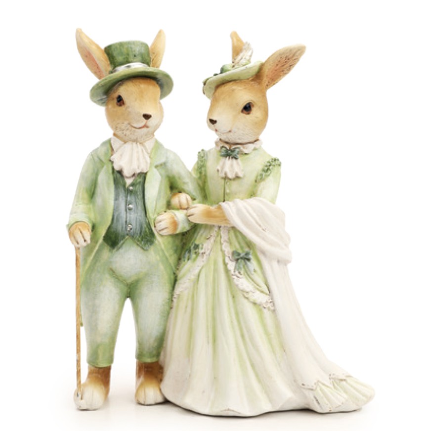 Casal Decorativo de Resina Coelhos Com Chapéu e Roupas de Epoca - Cromus - CCS Decorações e Embalagens