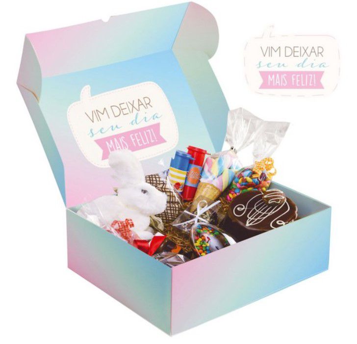 A Caixa Cesta é uma super novidade. Com impressão frente e verso, a cesta é uma ótima opção para montar um kit e fazer uma surpresa incrível!