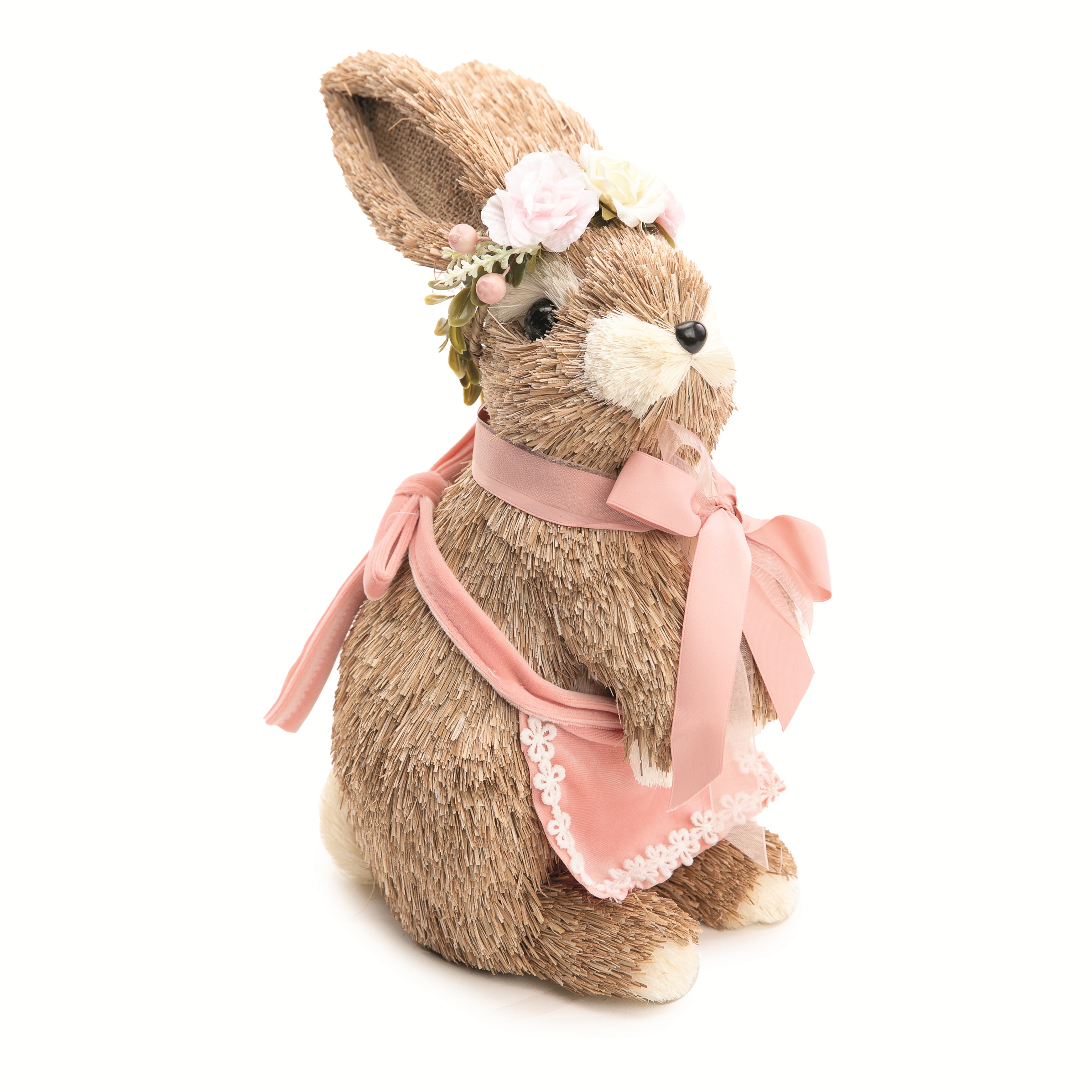 Coelha de Palha em Pé com Avental de Veludo Rosa, e Flores na Cabeça 30cm - Cromus - CCS Decorações e Embalagens