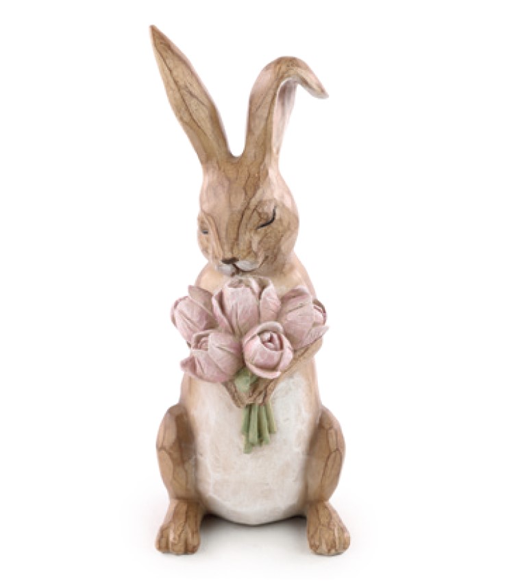 Coelho de Resina Efeito Amadeirado em Pé com Buque de Tulipas Rosê - Páscoa Cromus - CCS Decorações e Embalagens