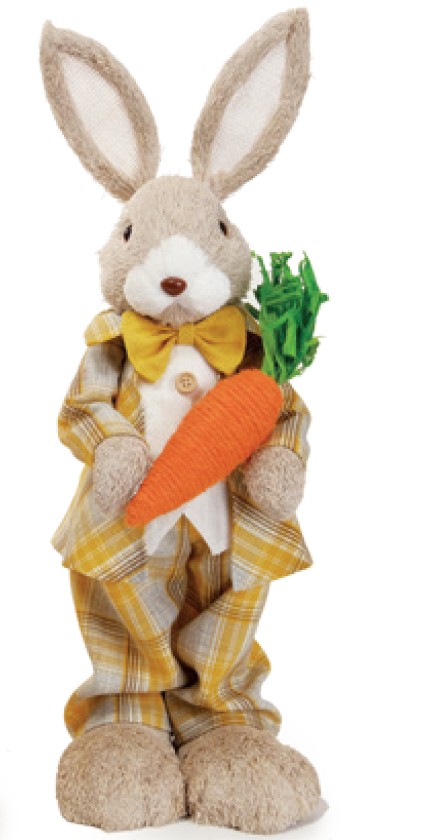 Coelho em Pé de Palha Italiana com Roupa Xadrez Amarela Segurando Cenoura - Páscoa Cromus - CCS Decorações e Embalagens