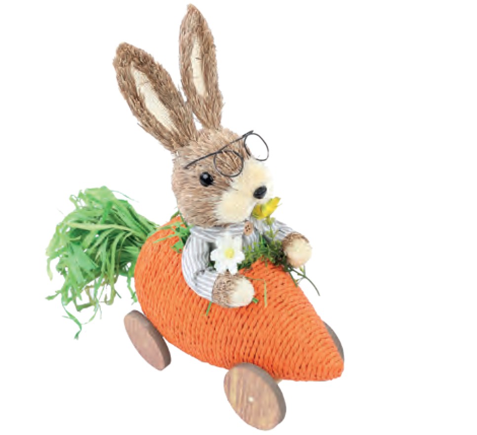 Coelho de Palha com Roupa Listrada Azul e Branca, Dirigindo Carro de Cenoura - Cromus - CCS Decorações e Embalagens