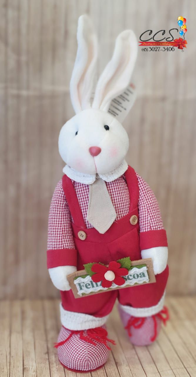 Ideal para Decorar ou presentear, o Coelho Sentado com Macacão e Placa de Feliz Páscoa, é uma opção linda pra decorar qualquer ambiente.