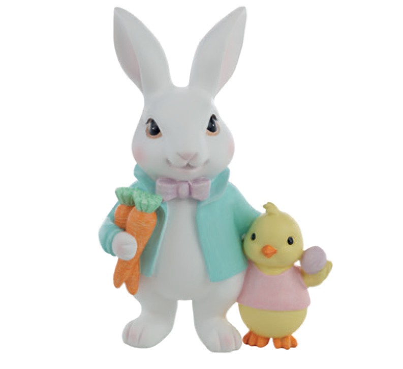 Enfeite de Resina Coelho Branco em Pé Abraçando Pintinho Amarelinho - Coleção Color Baby - Cromus - CCS Decorações e Embalagens