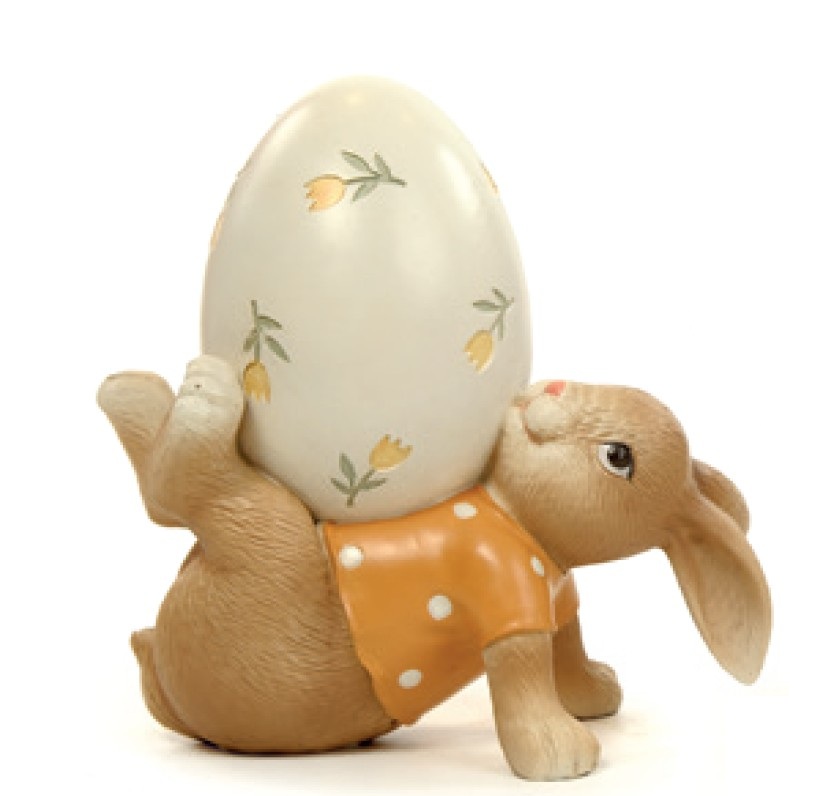 Coelho de Resina Deitado Equilibrando Ovo de Páscoa com Estampa de Tulipas - Coleção Breeze - Páscoa Cromus - CCS Decorações e Embalagens
