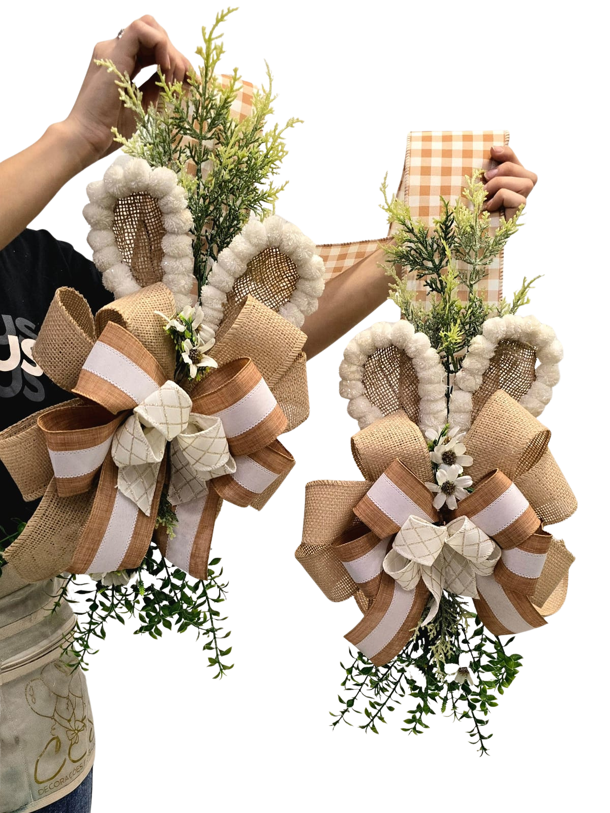 Escalpulário de Páscoa Xadrez Branco e Laranja Candy, com Laço de Juta Cru, de Linho com Listra, e Linho Xadrez Creme, Orelhas de Coelho de Pompom Branco e Juta, com Acabamento de Galhos e Flores - Páscoa Cromus - CCS Decorações e Embalagens