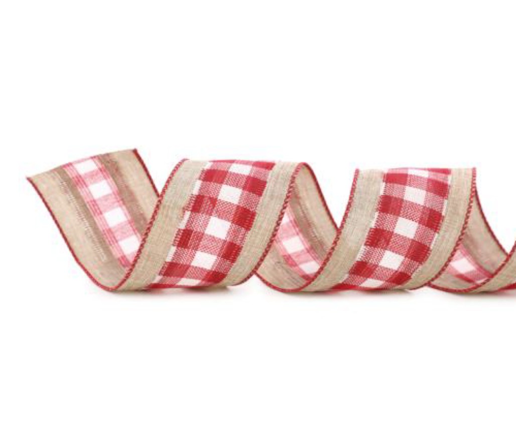 Fita Aramada de Natal Linho Cru com Faixa Central Xadrez Vermelha e Branca 6.3cm - Cromus - CCS Decorações e Embalagens