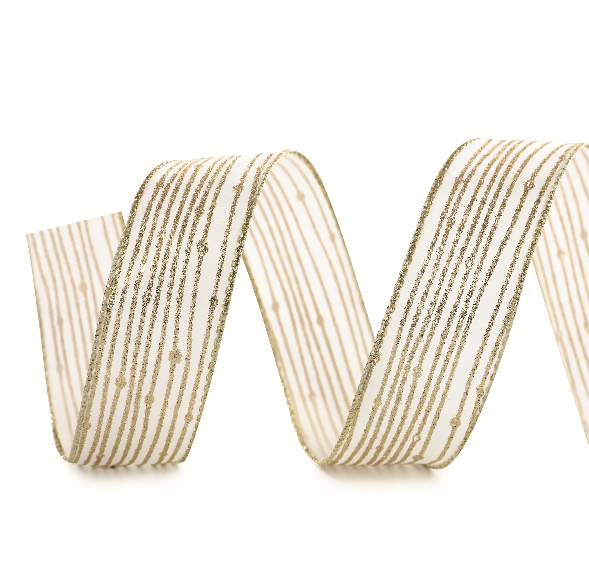 Fita Aramada de Natal Cetim Branco com Listras Glitter Dourado - Cromus - CCS Decorações e Embalagens