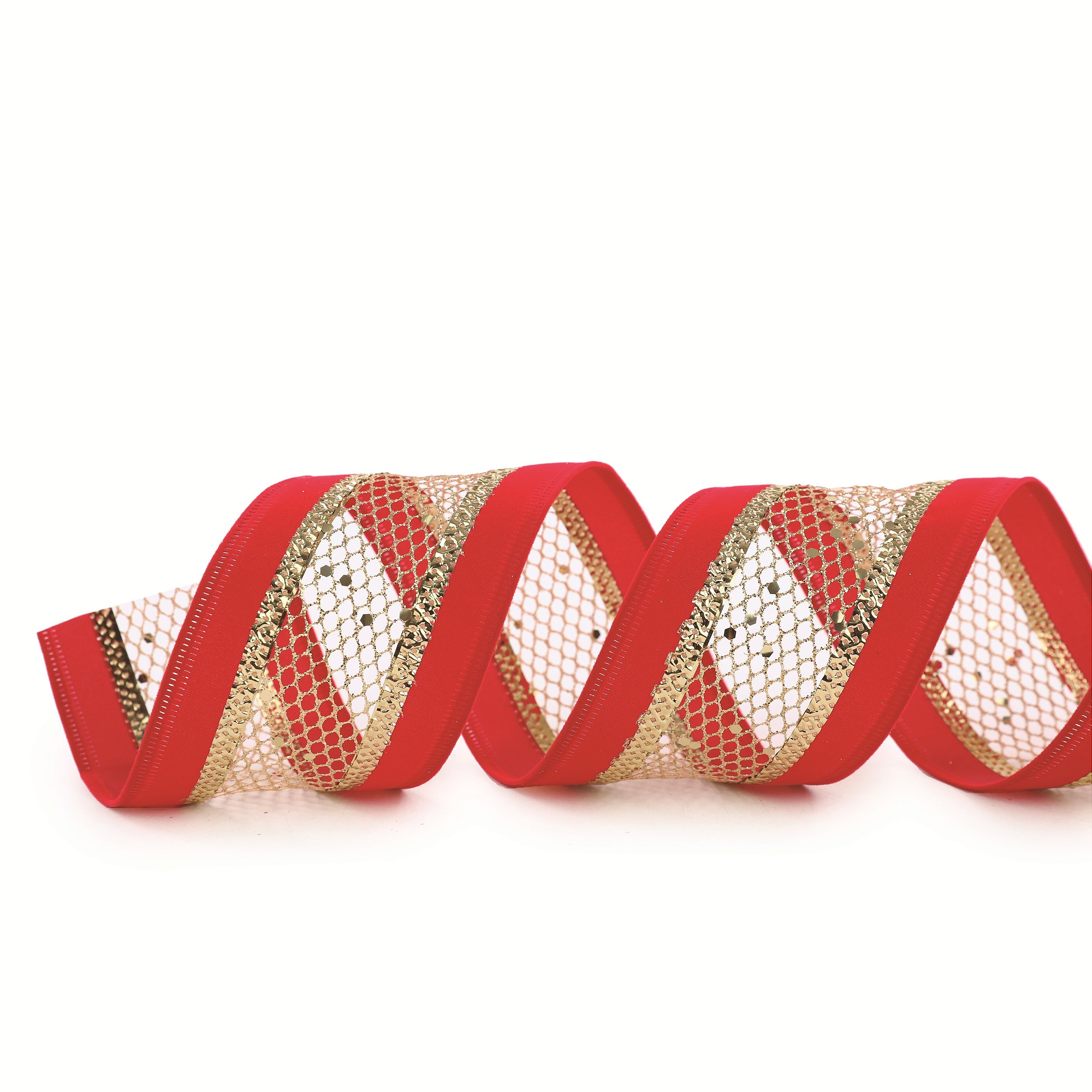 Fita Aramada de Natal Vermelha com Tela na Linha Central de Glitter Dourado - Cromus - CCS Decorações e Embalagens