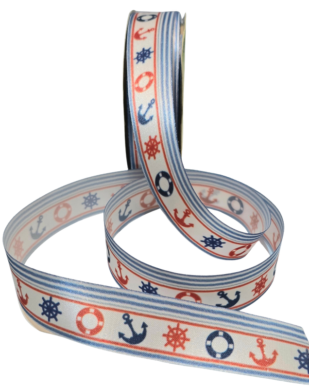 Fita de Cetim Estampa Digital Listras Marinheiro Branca 25mm com 10 Metros