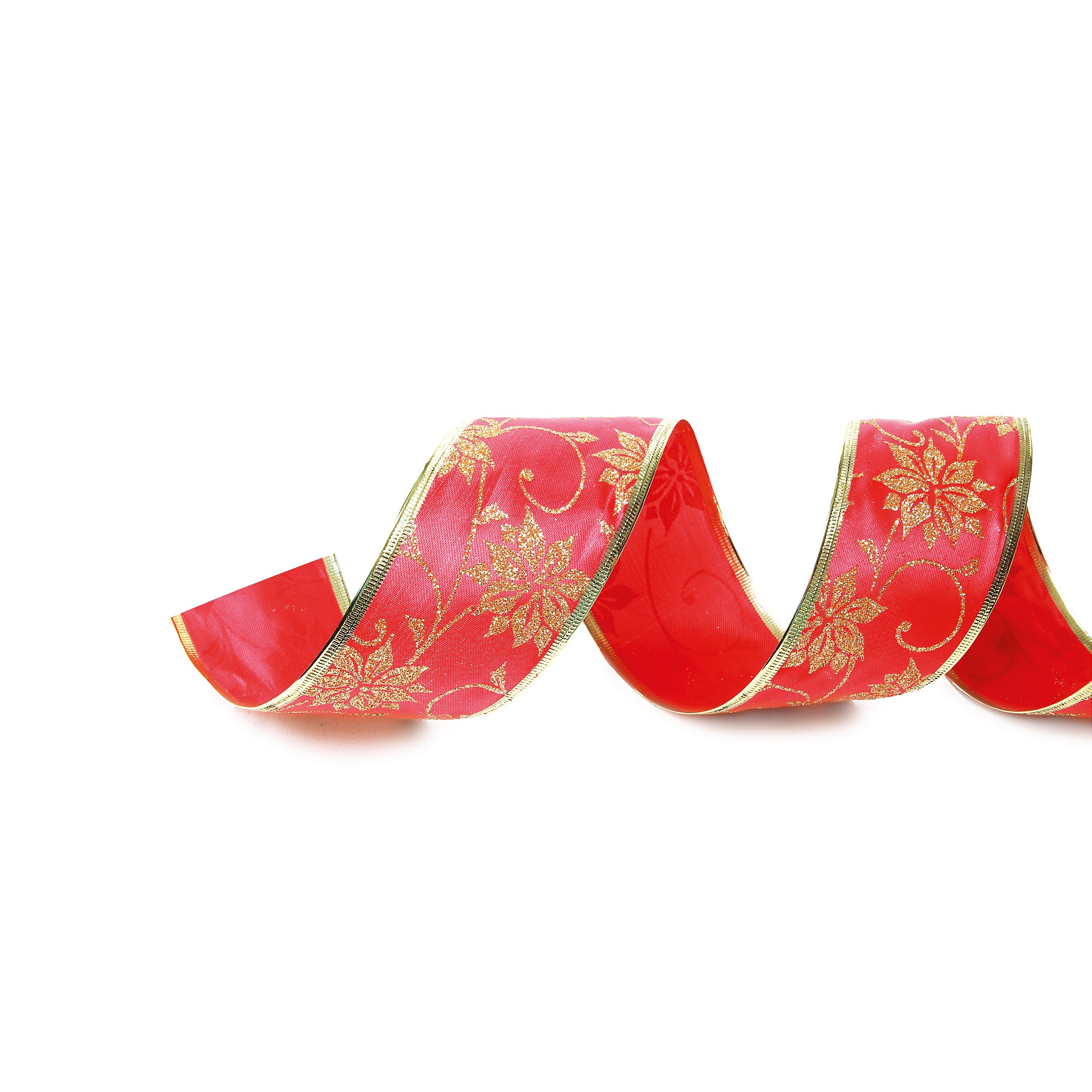 Fita Aramada de Natal Cetim Vermelho com Estampa de Flores Dourado 3.8cm - Cromus - CCS Decorações e Embalagens