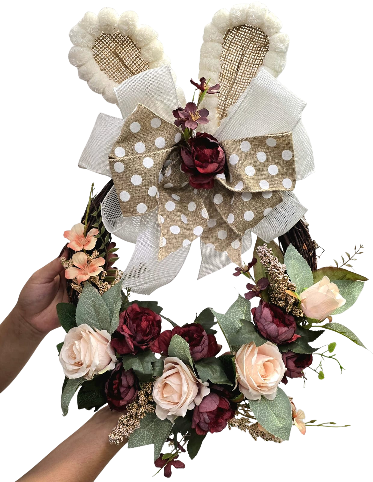 Guirlanda De Cipó Decorada de Páscoa, Flores Marsala e Rose com Orelhas de Coelho Pompom e Laço - CCS Decorações e Embalagens.