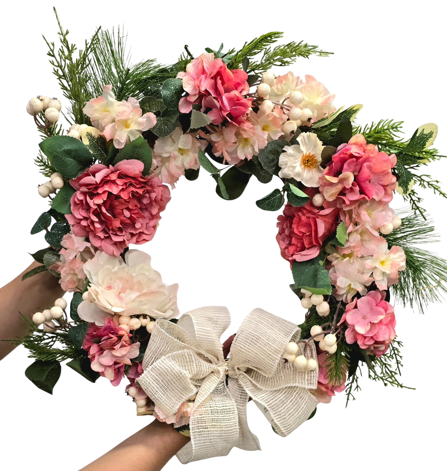 Guirlanda de Cipó Decorada de Páscoa com Hortências, Peônias e Folhagens de Eucaipto e Outras Plantas Verdes, com Acabamento de Frtutinhas Off e Laço - CCS Decorações e Embalagens.