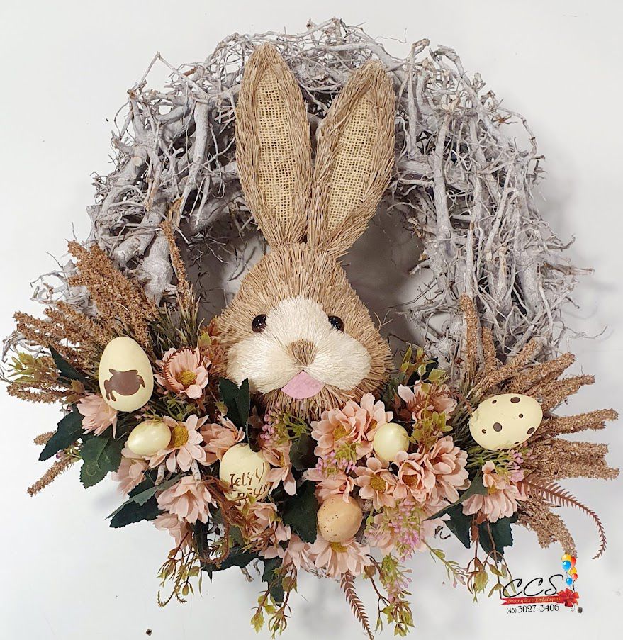 Guirlanda Decorada de Páscoa Galhos Patina Branca com Aplique de Cabeça de Coelho de Palha e Flores - Páscoa Cromus