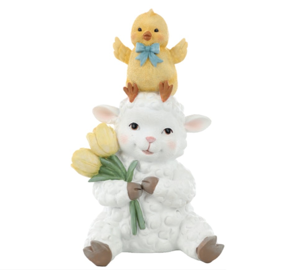 Enfeite de Resina Ovelha Branca Sentada Segurando Maço de Flores Amarelas, com Pintinho na Cabeça - Coleção Color Baby - Cromus - CCS Decorações e Embalagens