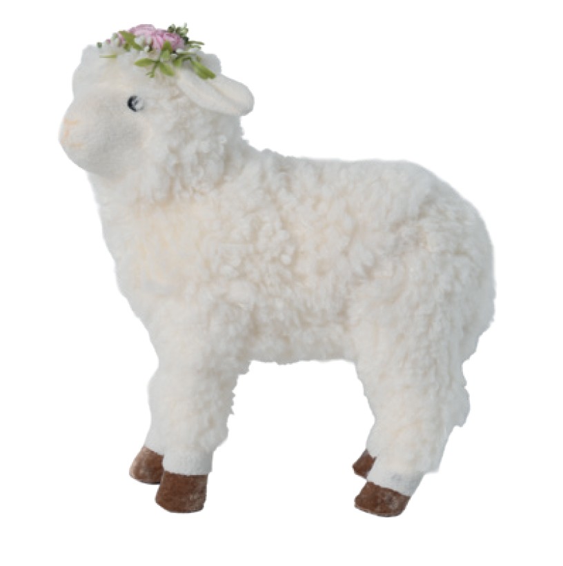 Enfeite Ovelha em Pé de Pelo Sintetico e Coroa de Flores na Cabeça - Cromus Páscoa - CCS Decorações e Embalagens