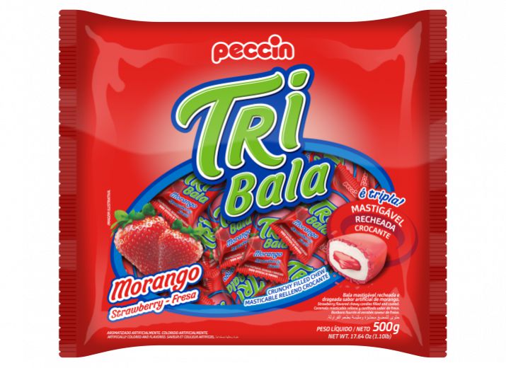 Bala mastigável recheada e drageada sabor artificial de morango.