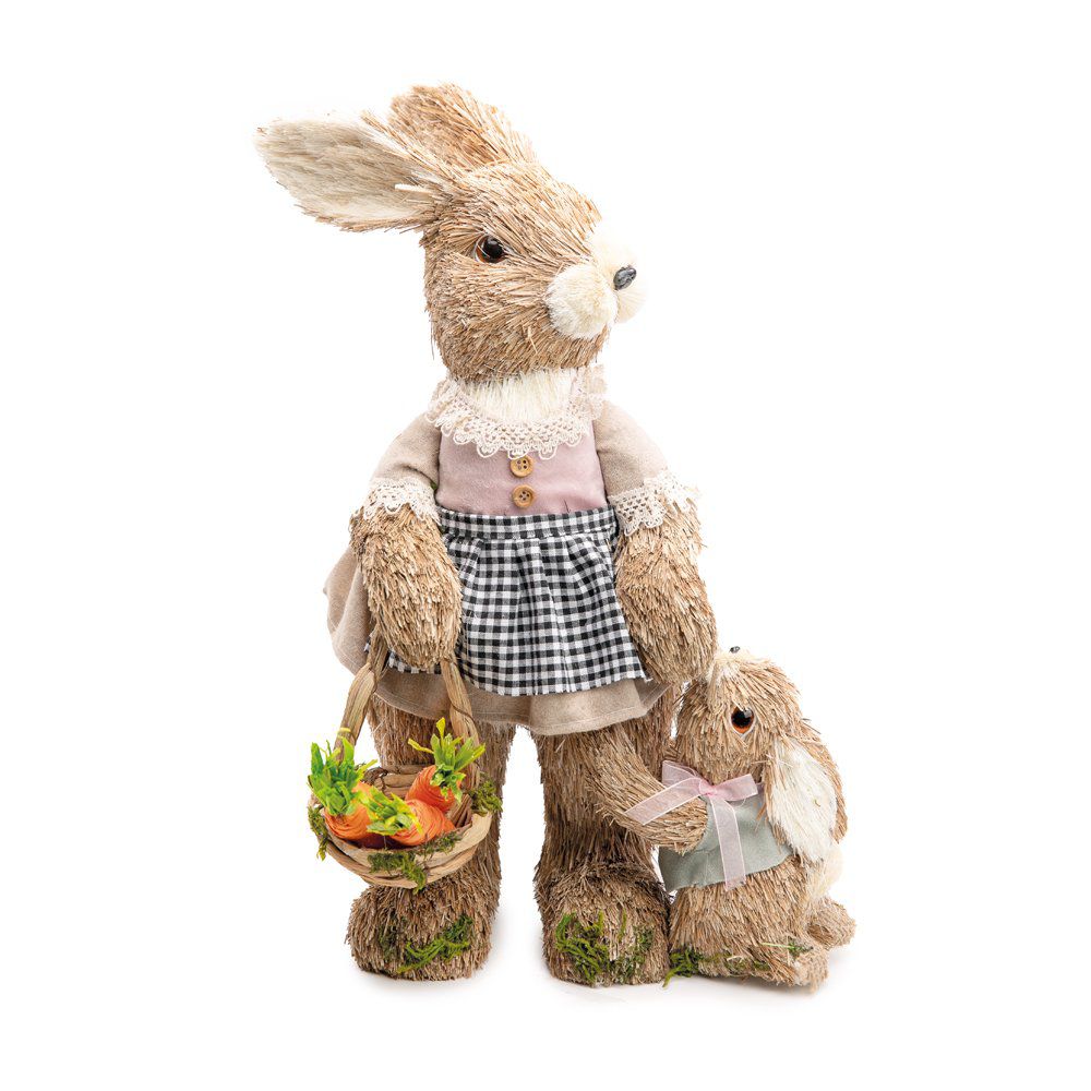 Coelha Decorativa de Palha em Pé Filhote e Avental Xadrez Preto e Branco - CCS Decorações e Embalagens.