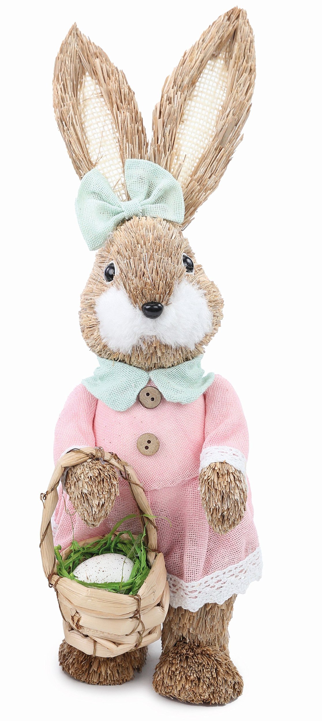 Coelha de Palha em Pé com Vestido Rosa, Segurando Cesta de Ovos - Coleção Palmier - Cromus - CCS Decorações e Embalagens