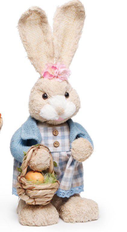 Coelha de Palha Italiana em Pé com Vestido Xadrez e Casaco de Juta Azul Segurando Cesto de Ovos - Cromus - CCS Decorações e Embalagens