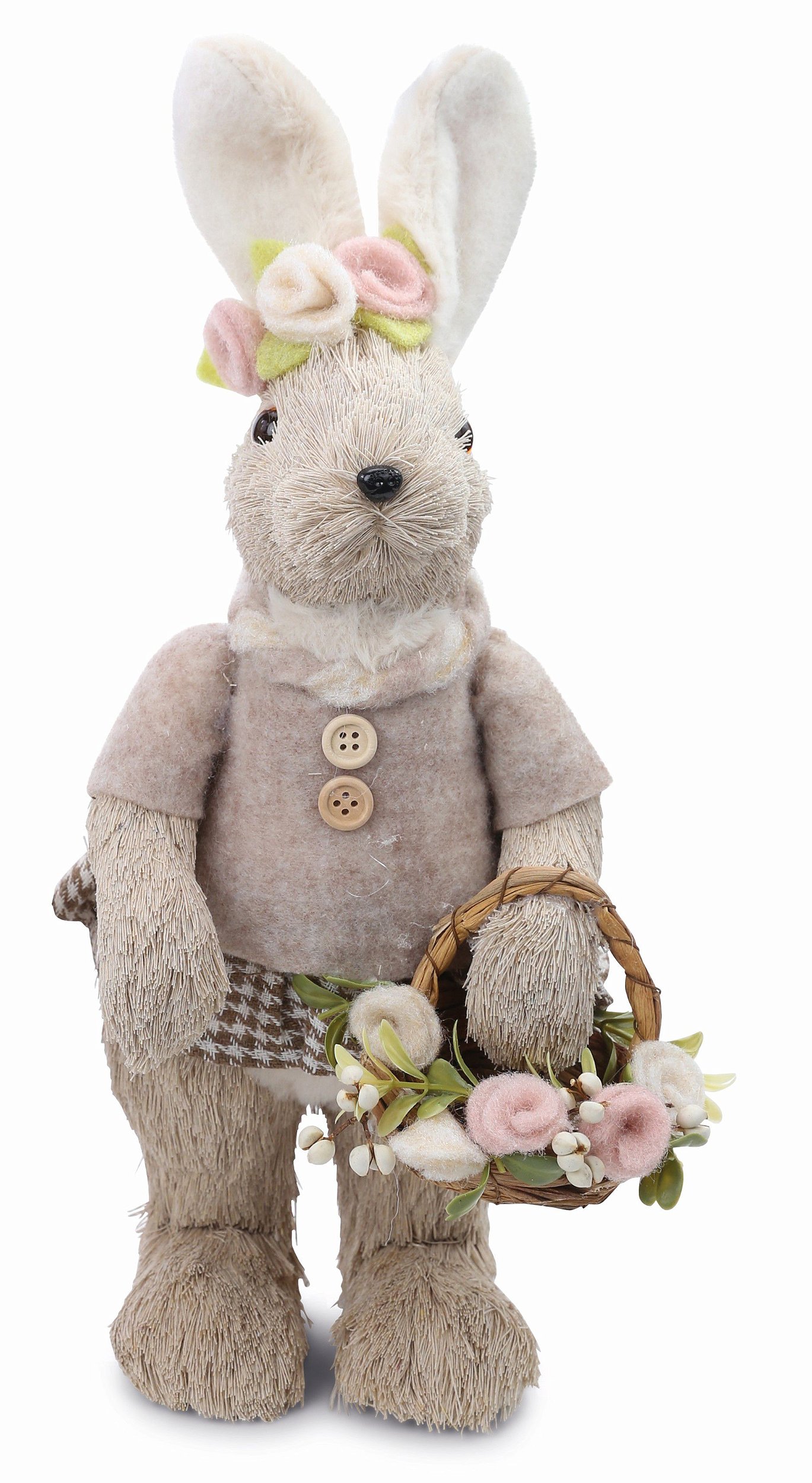 Coelha de Palha Italiana e Pelúcia em Pé com Roupa Xadrez, Segurando Cesta de Flores - Coleção Fazendinha - Cromus - CCS Decorações e Embalagens