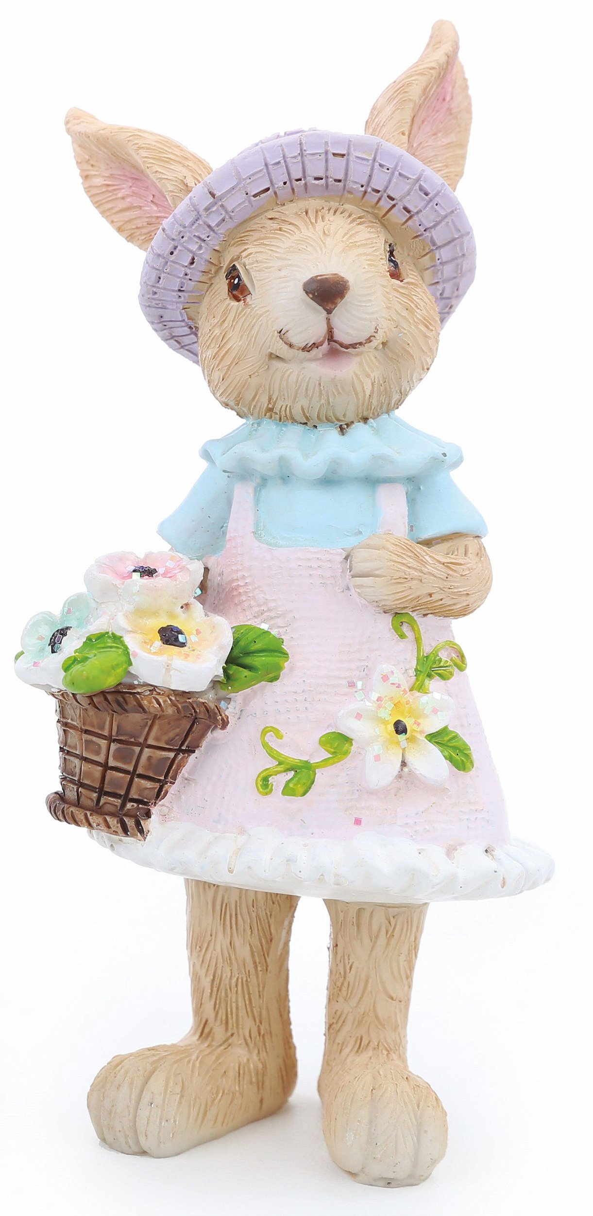 Coelha Decorativa de Resina com Chapéu Rosa e Jardineira, Segurando Cesta de Flores - Coleção Petit Sweet - Páscoa Cromus - CCS Decorações e Embalagens