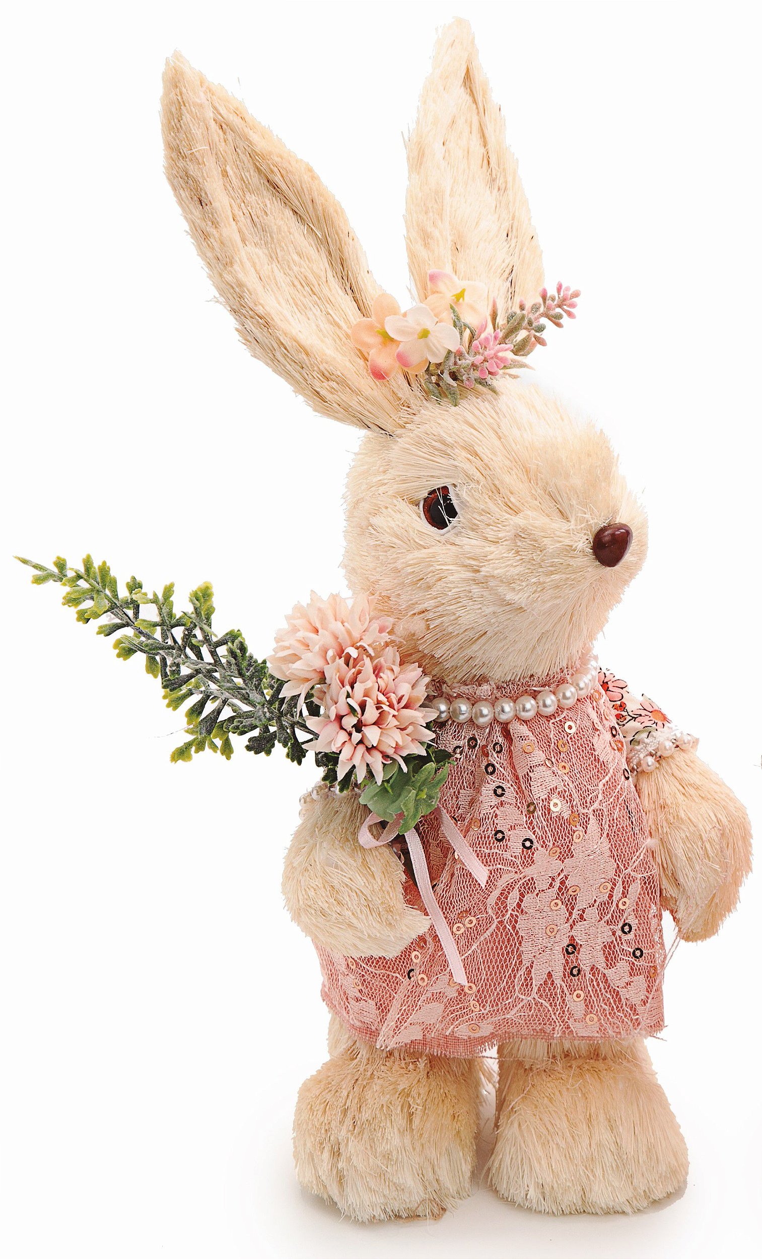 Coelha de Palha Creme em Pé com Maço de Flores na Mão e Vestido de Renda - Coleção Green Gables - Cromus - CCS Decorações e Embalagens