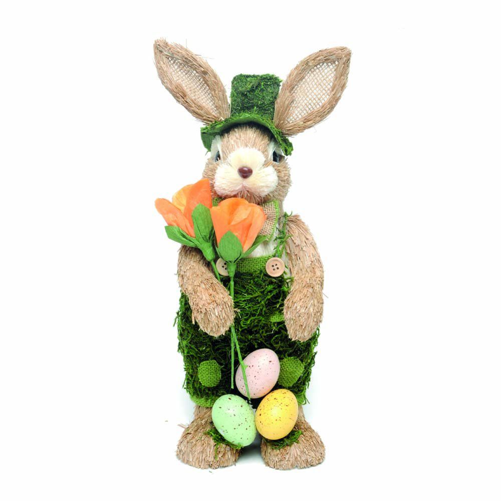 Coelho de Palha Com Jardineira de Musgo Segurando Flores e Ovos 42cm - Páscoa Cromus - CCS Decorações e Embalagens