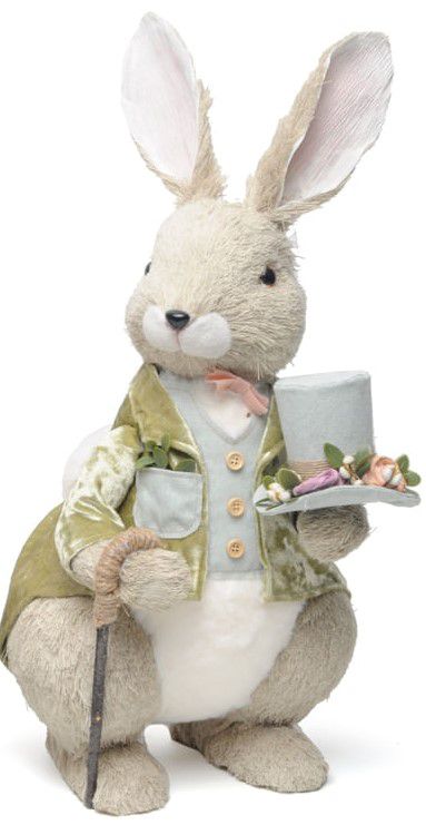 Coelho de Palha Italiana com Paletó Verde Claro de Veludo e Cartola com Flores 50cm - Cromus - CCS Decorações e Embalagens