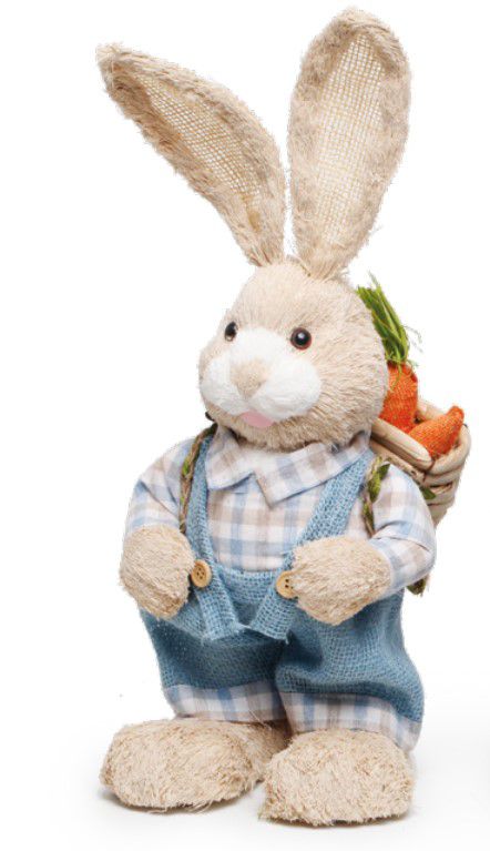 Coelho de Palha Italiana em Pé com Macacão de Juta Azul e Cesto de Cenouras nas Costas - Cromus - CCS Decorações e Embalagens