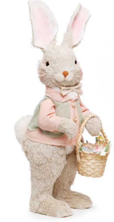 Coelho Decorativa de Palha Italiana Com Colete, Segurando Cesta com Ovos e Flores - Cromus - CCS Decorações e Embalagens