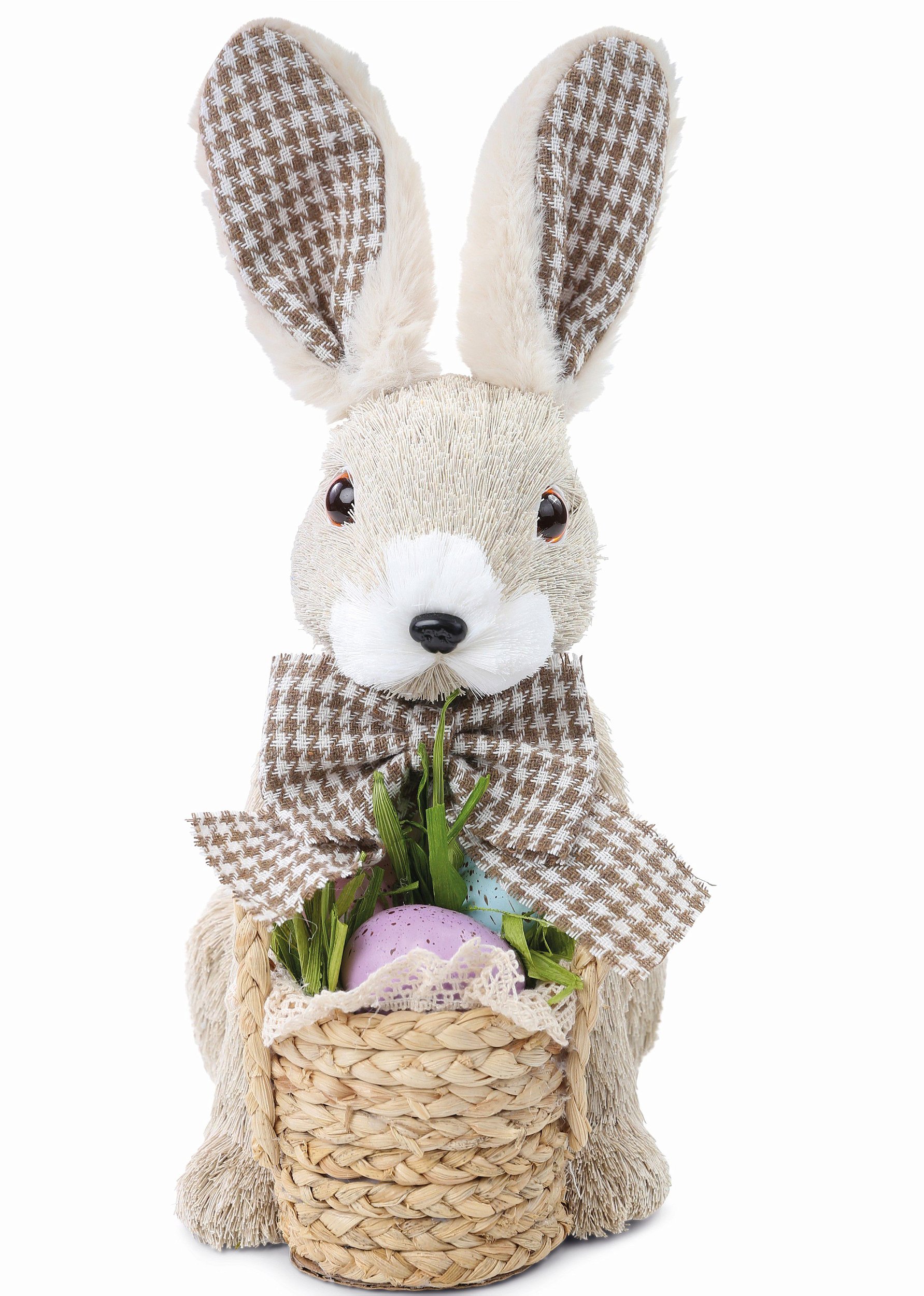 Coelho de Palha Italiana e Pelúcia Sentado com Laço Xadrez, Segurando Cesta de Trança de Palha - Coleção Fazendinha - Cromus - CCS Decorações e Embalagens