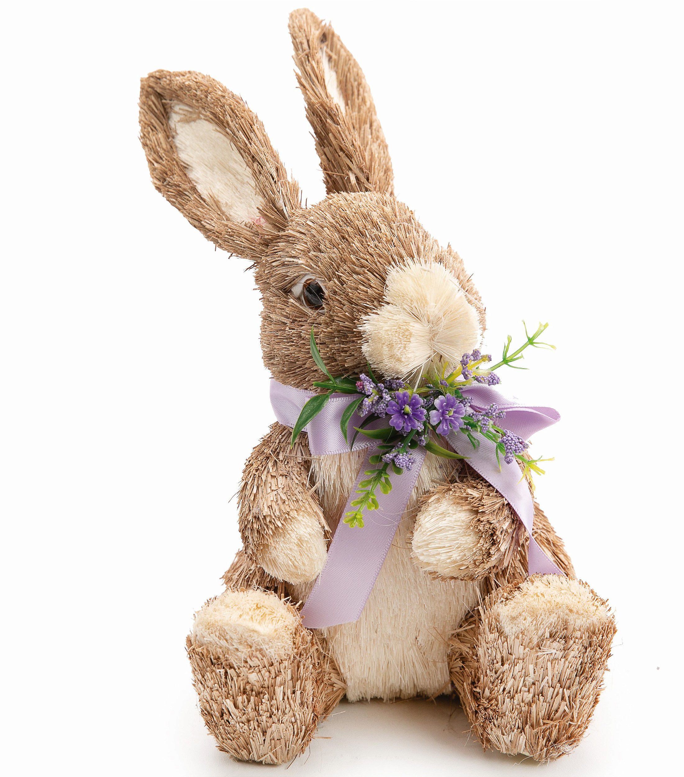 Coelho de Palha Sentado com Laço e Flores Lilas no Pescoço - Coleção Canelinha - Cromus - CCS Decorações e Embalagens