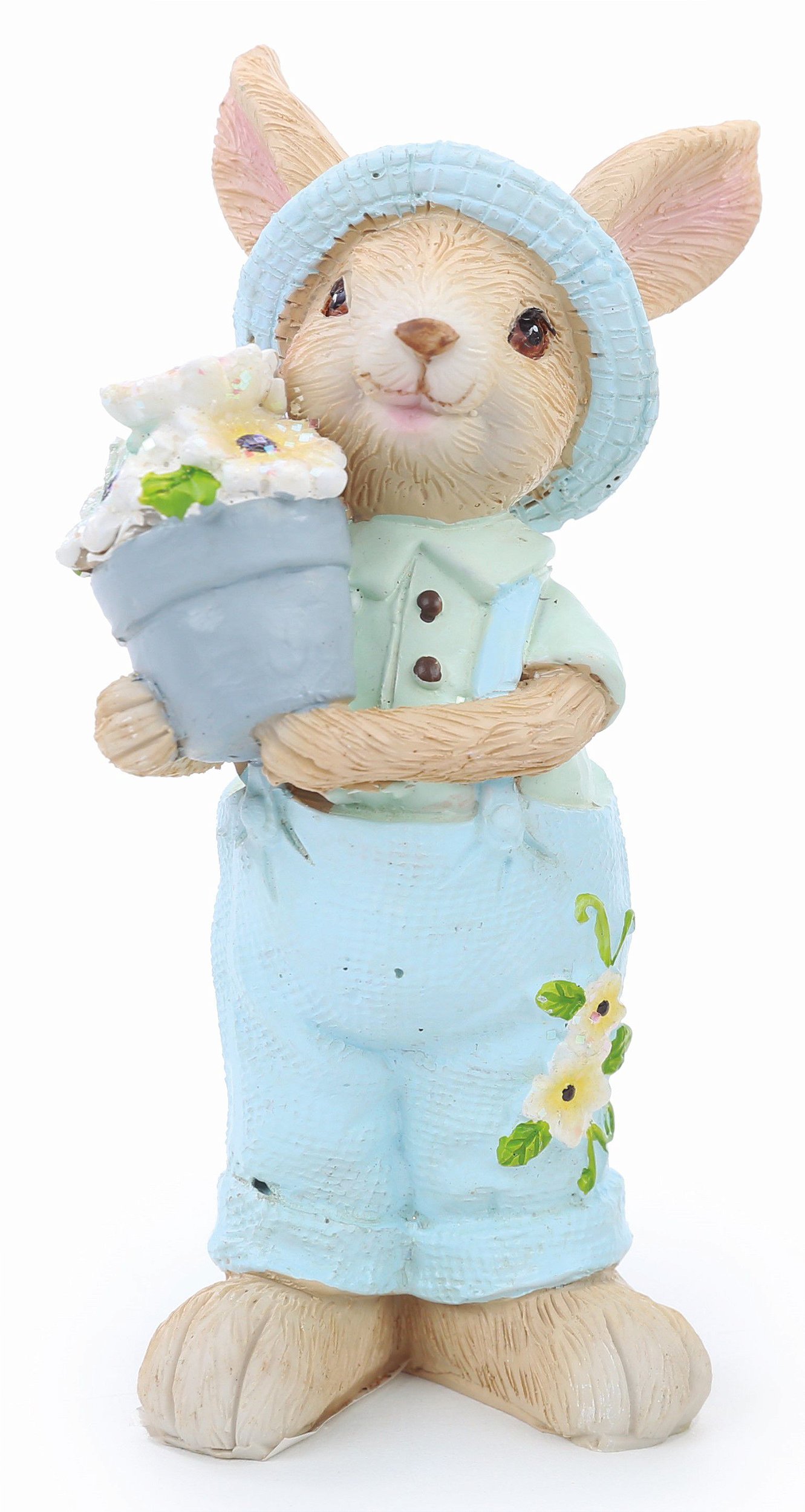 Coelho Decorativo de Resina com Chapéu Azul e Macacão, Segurando Vaso de Flores - Coleção Petit Sweet - Páscoa Cromus - CCS Decorações e Embalagens