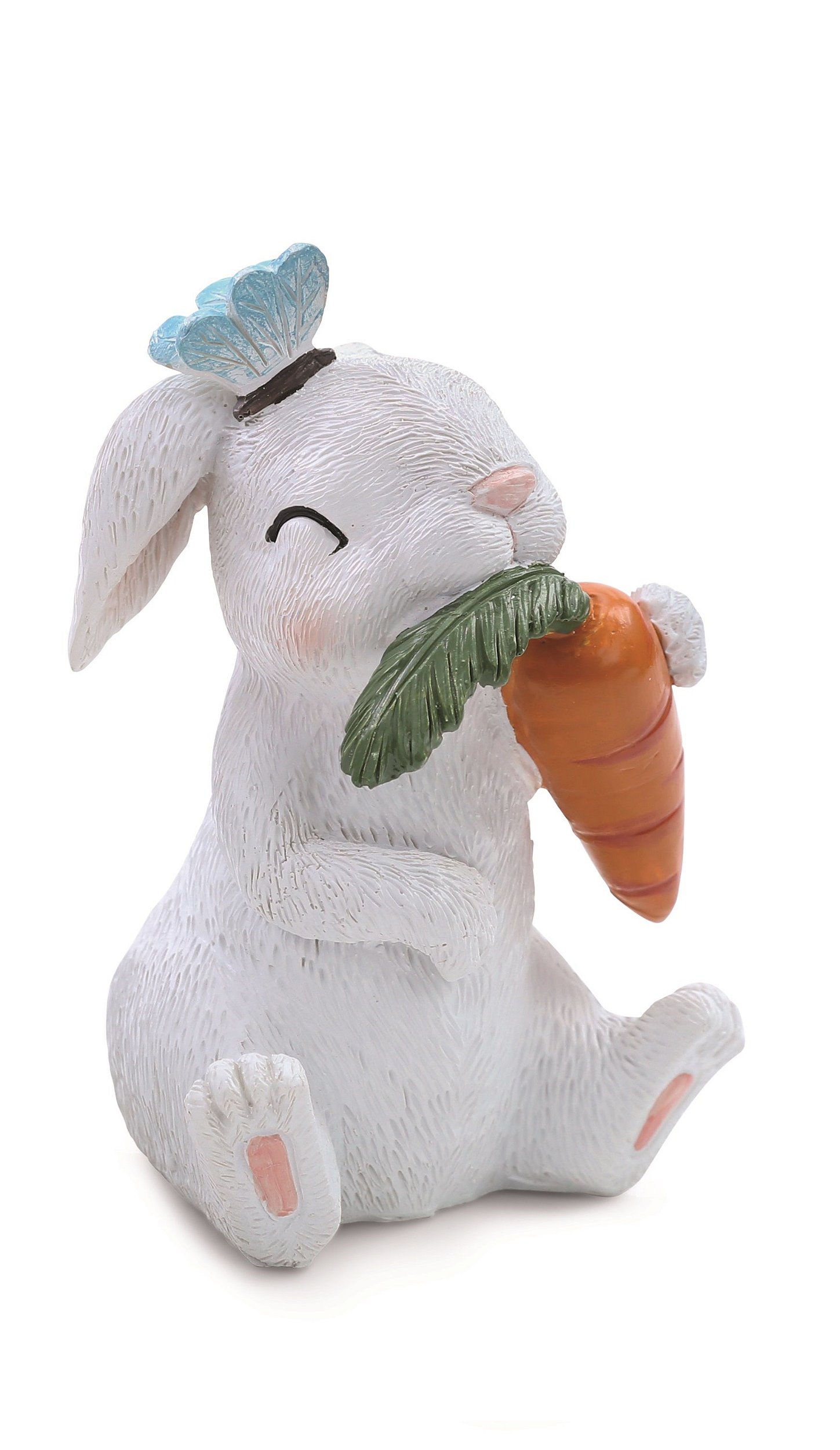 Coelho Decorativo de Resina Sentado Comendo Cenoura e com Borboleta na Cabeça - Coleção Flower - Páscoa Cromus - CCS Decorações e Embalagens
