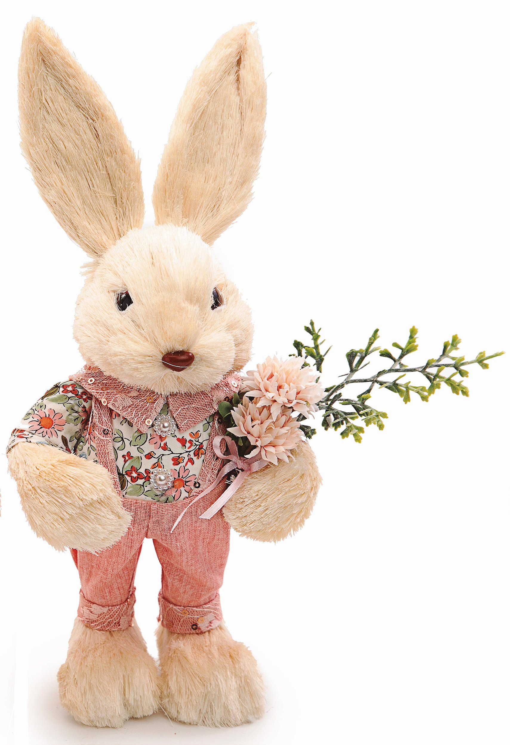 Coelho de Palha Creme em Pé com Maço de Flores na Mão e Roupa Florida - Coleção Green Gables - Cromus - CCS Decorações e Embalagens