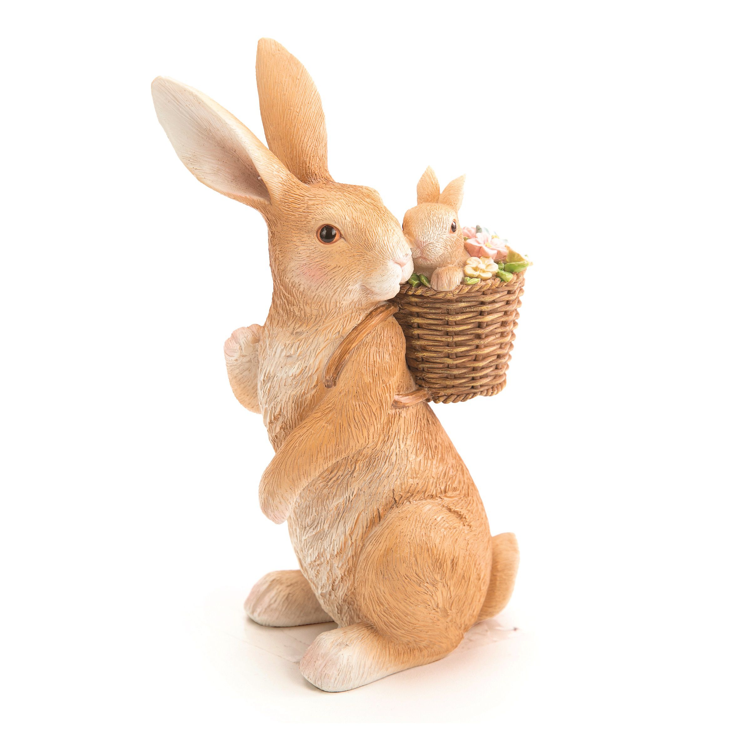 Coelha Decorativa de Resina com Filhote no Cesto de Flores nas Costas - Coleção Ternura - Páscoa Cromus - CCS Decorações e Embalagens
