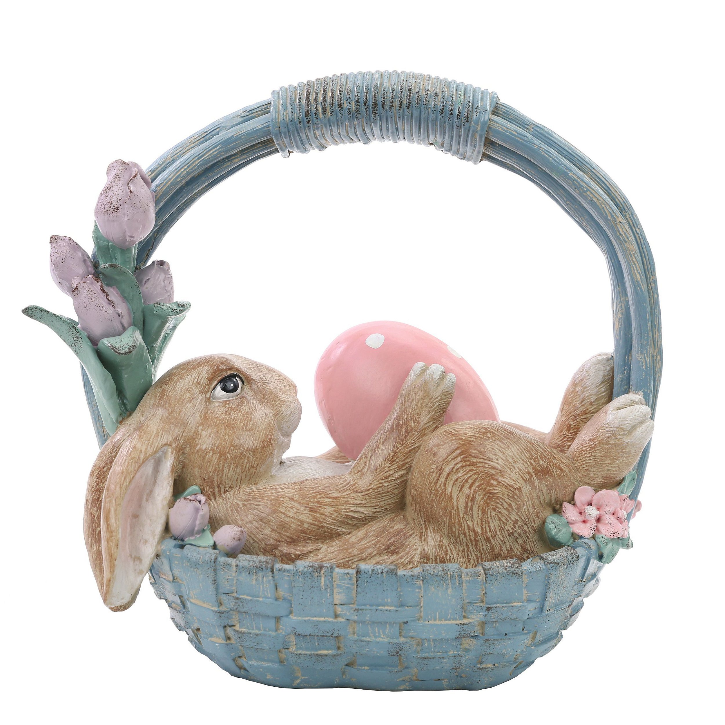 Coelho Decorativo de Resina Deitado na Cesta com Flores e Ovos de Páscoa - Coleção Cute Family- Páscoa Cromus - CCS Decorações e Embalagens