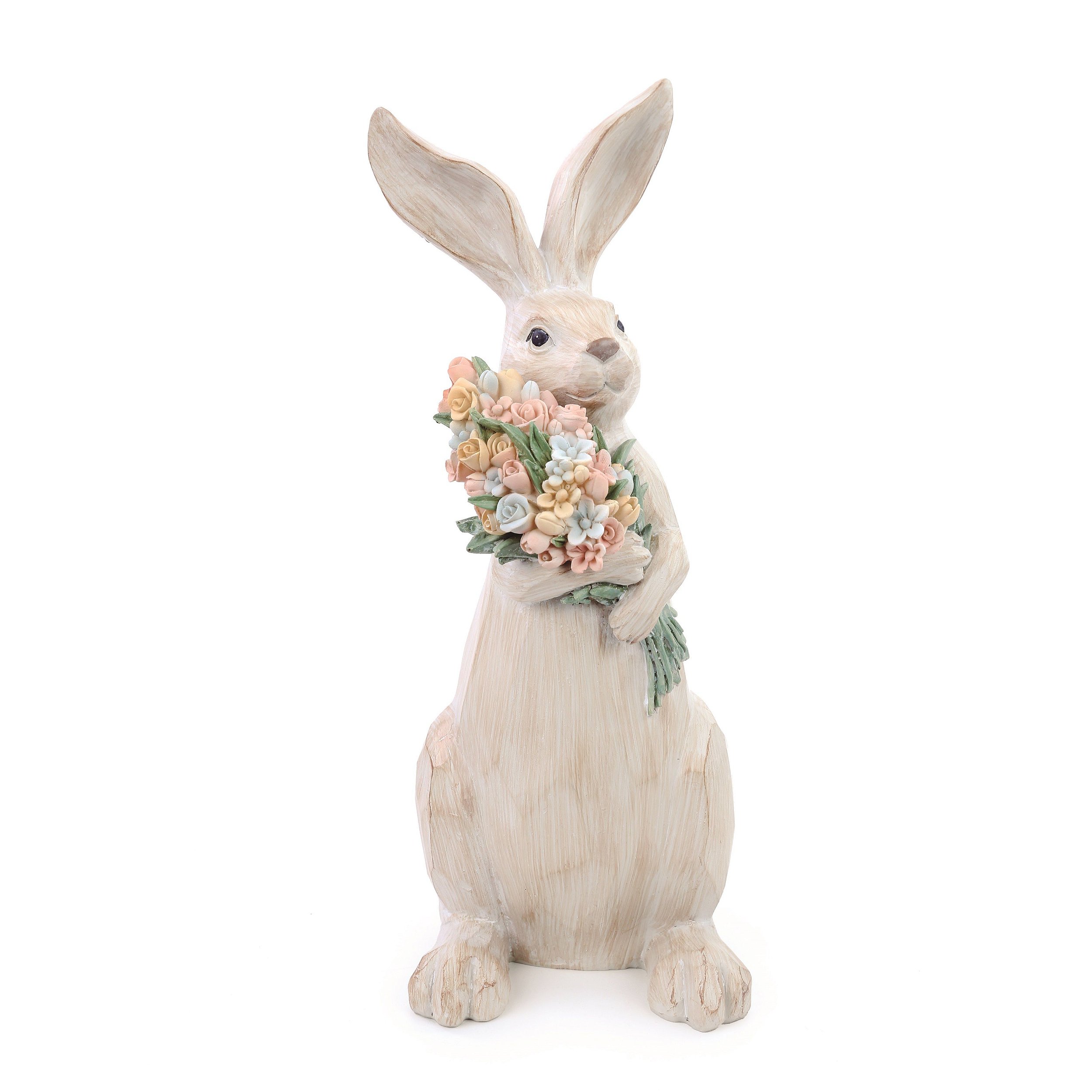 Coelho Decorativo de Resina Tipo Madeira com Buque de Flores na Mão e Led - Coleção Gallery - Páscoa Cromus - CCS Decorações e Embalagens