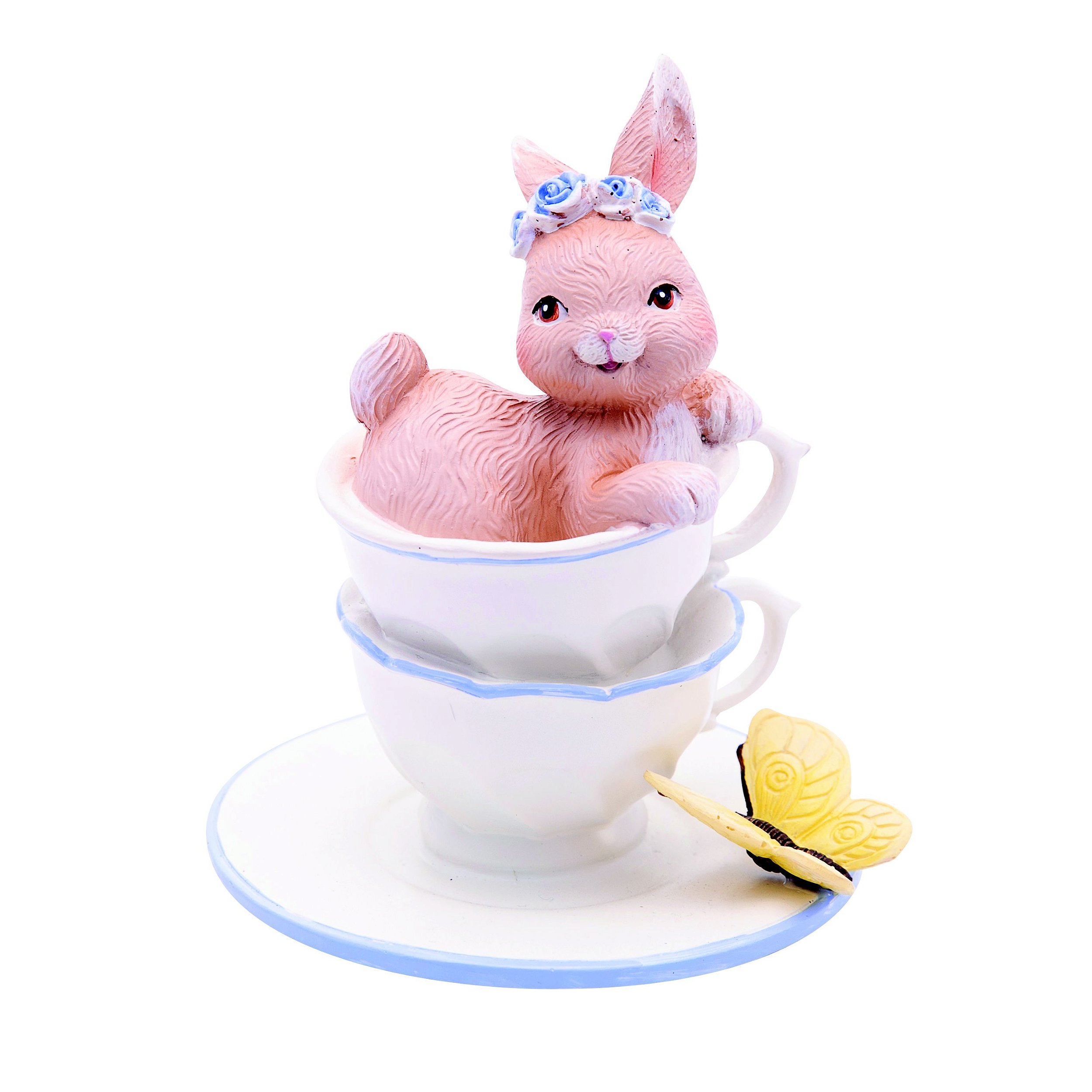 Coelho Decorativo de Resina na Pilha de Xicaras Branco e Azul com Borboleta Amarela - Coleção Fofura - Páscoa Cromus - CCS Decorações e Embalagens