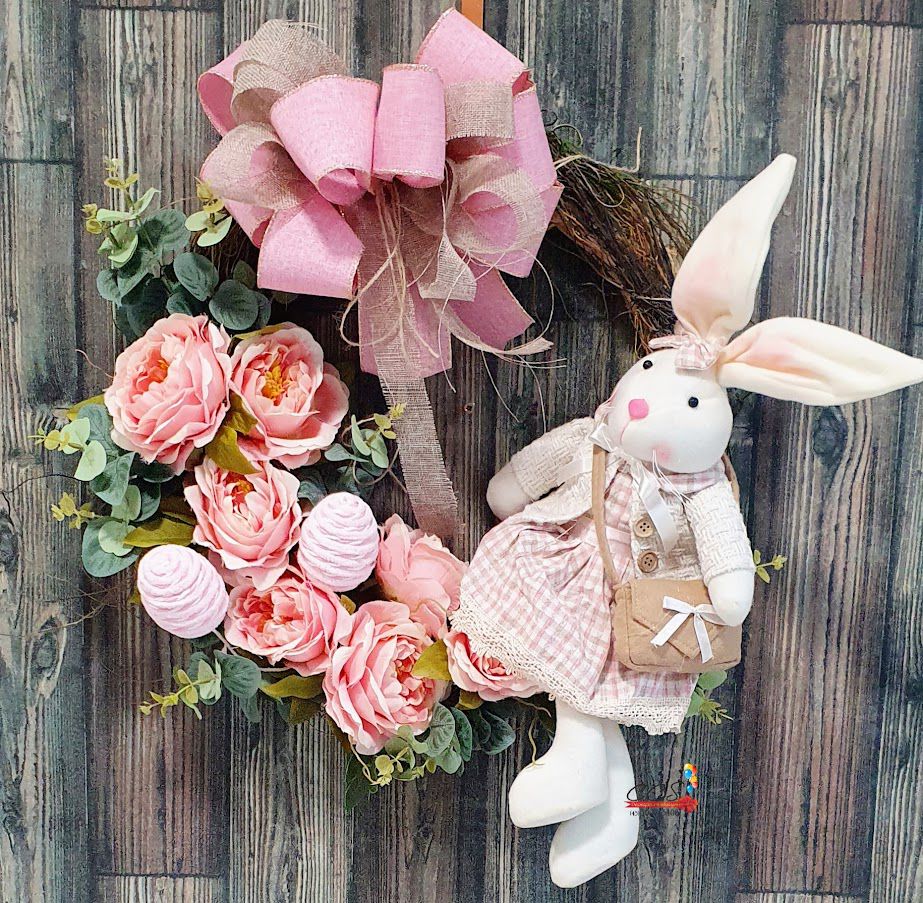 Guirlanda de Páscoa Decorada Flores e Eucalipto com Coelha de Vestido Sentada e Laço - 45cm - CCS Decorações e Embalagens