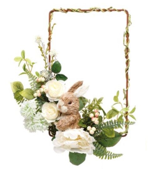 Guirlanda De Páscoa Retangular com Coelho de Páscoa de Palha e Flores Brancas com Galhos Verdes - Coleção Fondant - Páscoa Cromus - CCS Decorações e Embalagens