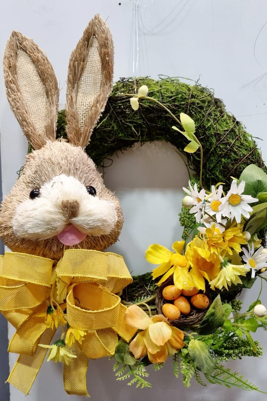 Guirlanda Decorada de Páscoa de Musgo com Aplique de Flores Amarelas e Cabeça de Coelho de Palha - CCS Decorações e Embalagens.