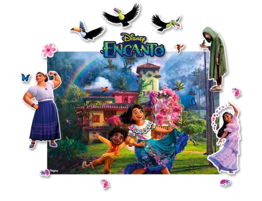 Kit Painel Decorativo com Painel 64x45cm e 20 Apliques diversos Festa Encanto Disney - Regina Festas - CCS Decorações e Embalagens