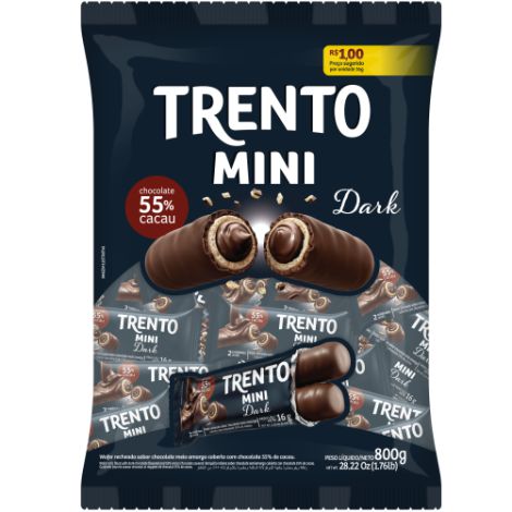 Trento Mini Dark, wafer crocante recheado sabor chocolate meio amargo coberto com chocolate 55% de cacau.